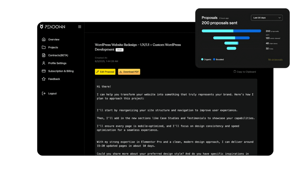 Most freelancers lose projects not because of poor skills, but because their proposals don’t stand out. Pendown fixes that — in just a few clicks.